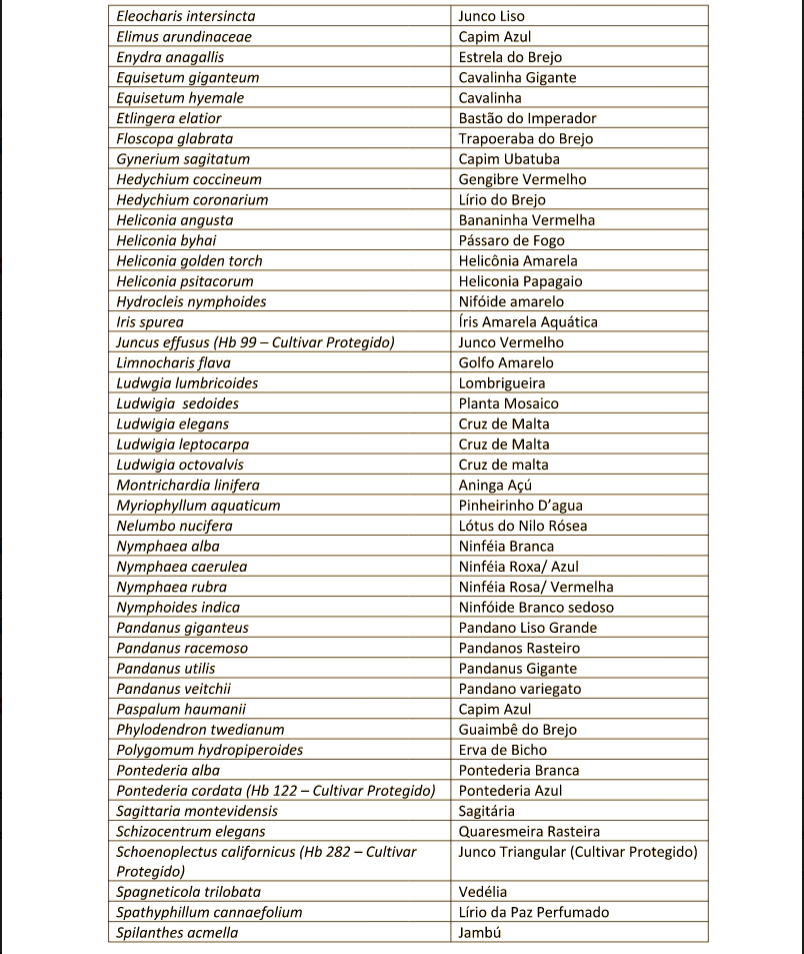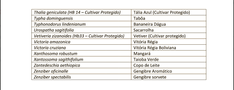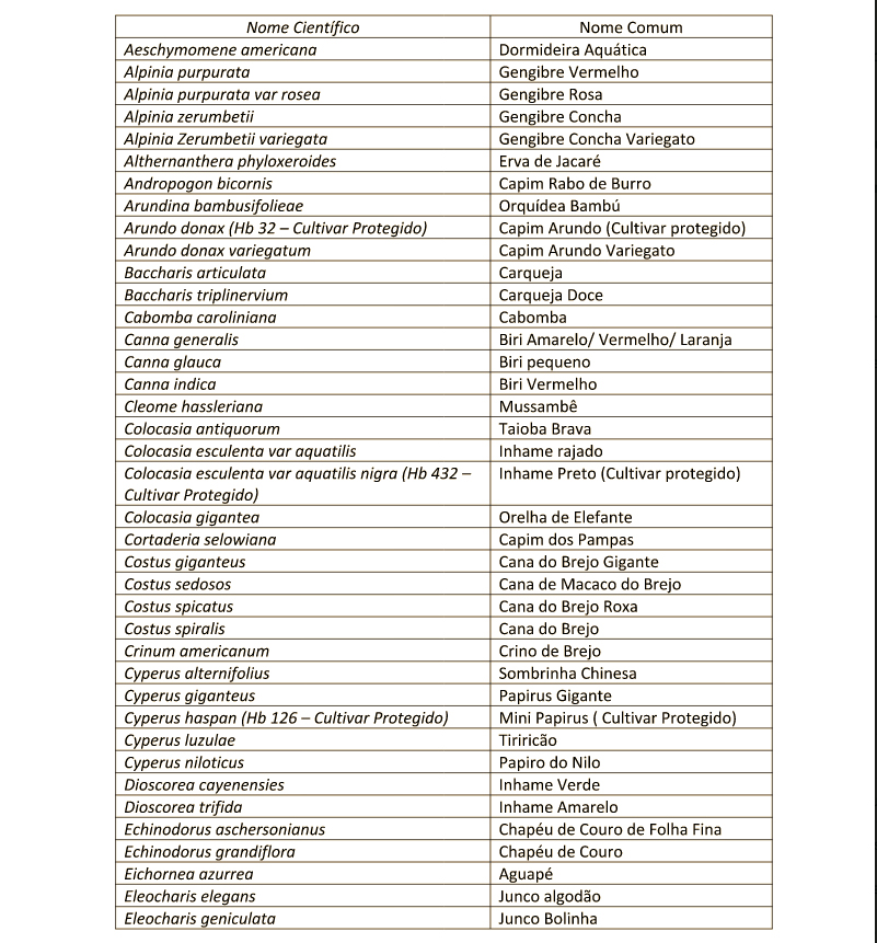 Disponibilizamos um total de 142 espécies de plantas aquáticas, o que supre as necessidades de; tratamento de efluentes, recuperação de áreas úmidas degradadas e